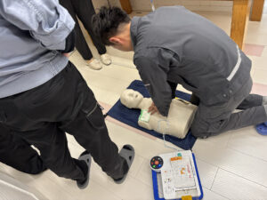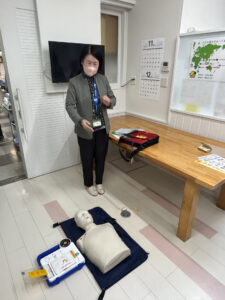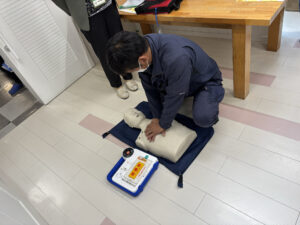 昨日、社内勉強会でAEDのデモンストレーションを行いました。