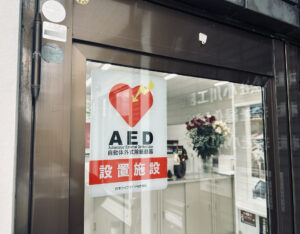 当社では、緊急時に備え、 玄関前にAEDを設置しております。