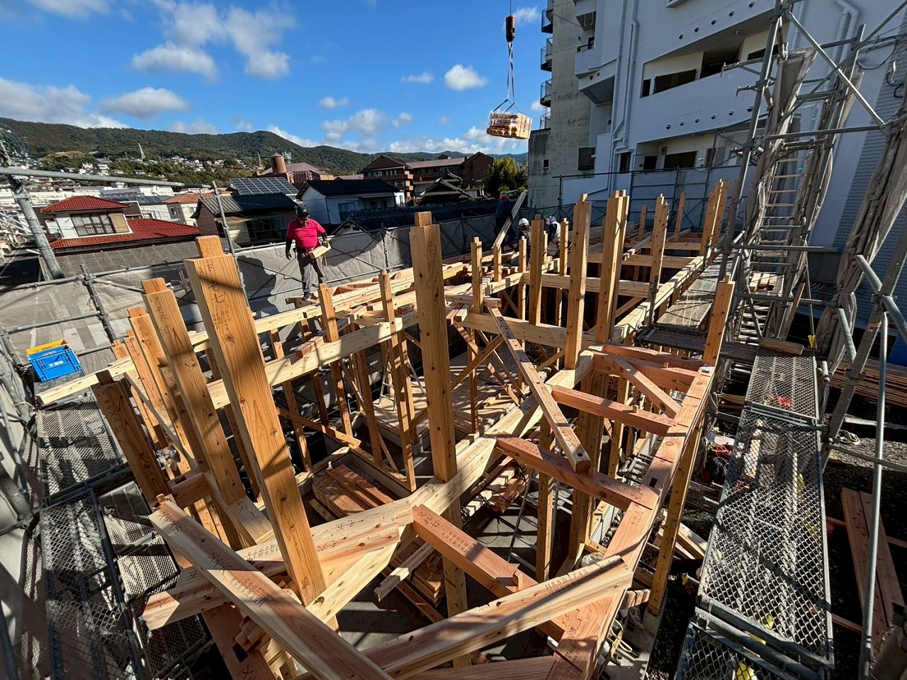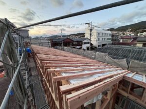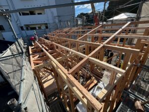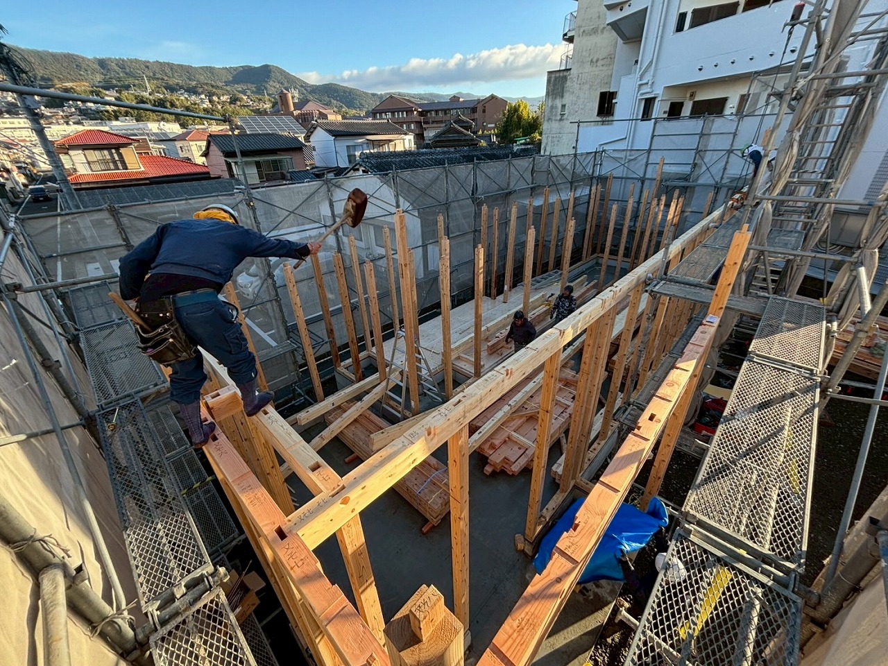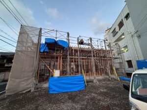 C様店舗 棟上げを行いました2025年12月27日 先日、瀬戸越4丁目 C様店舗の棟上げを行いました✨ 無事に棟上げが完了しました🏠 現在は耐震パネルの施工・サッシの取付を行ってます👷 来年も安全第一で工事を進めて参ります!