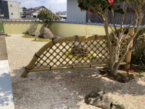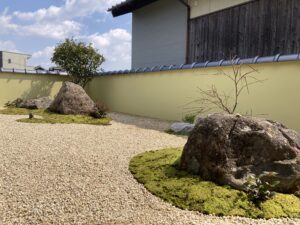 赤の枝垂れもみじをアクセントに、その周りに伊勢砂利を敷均し